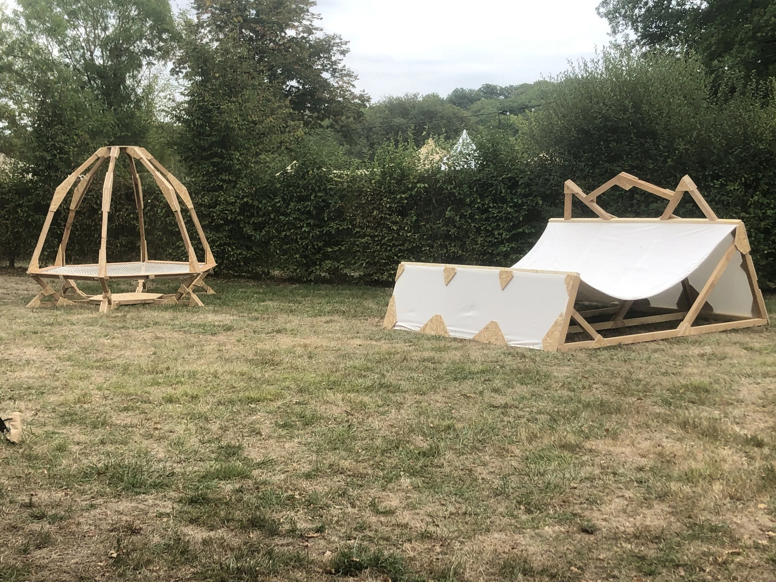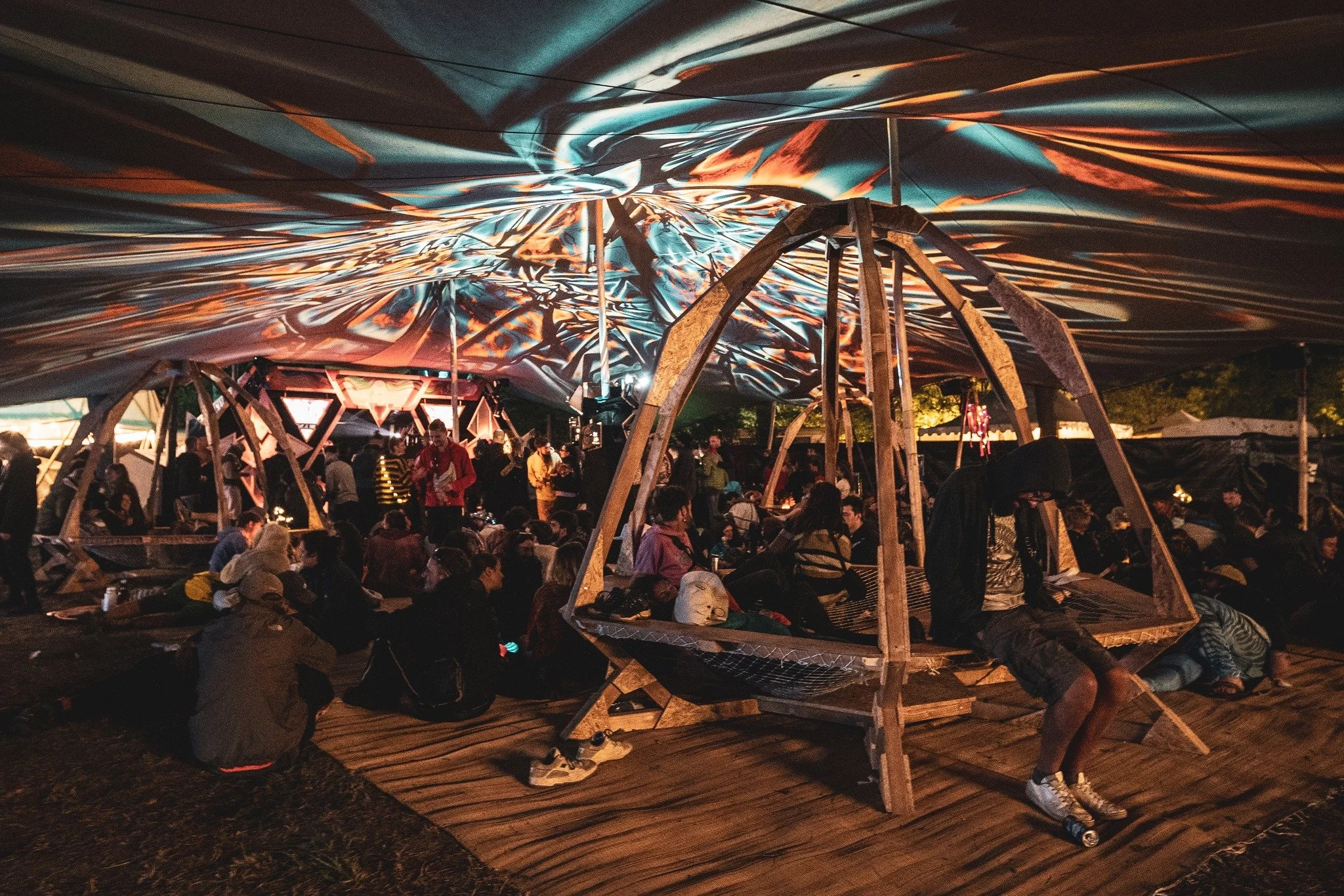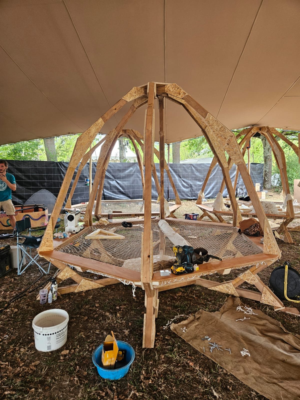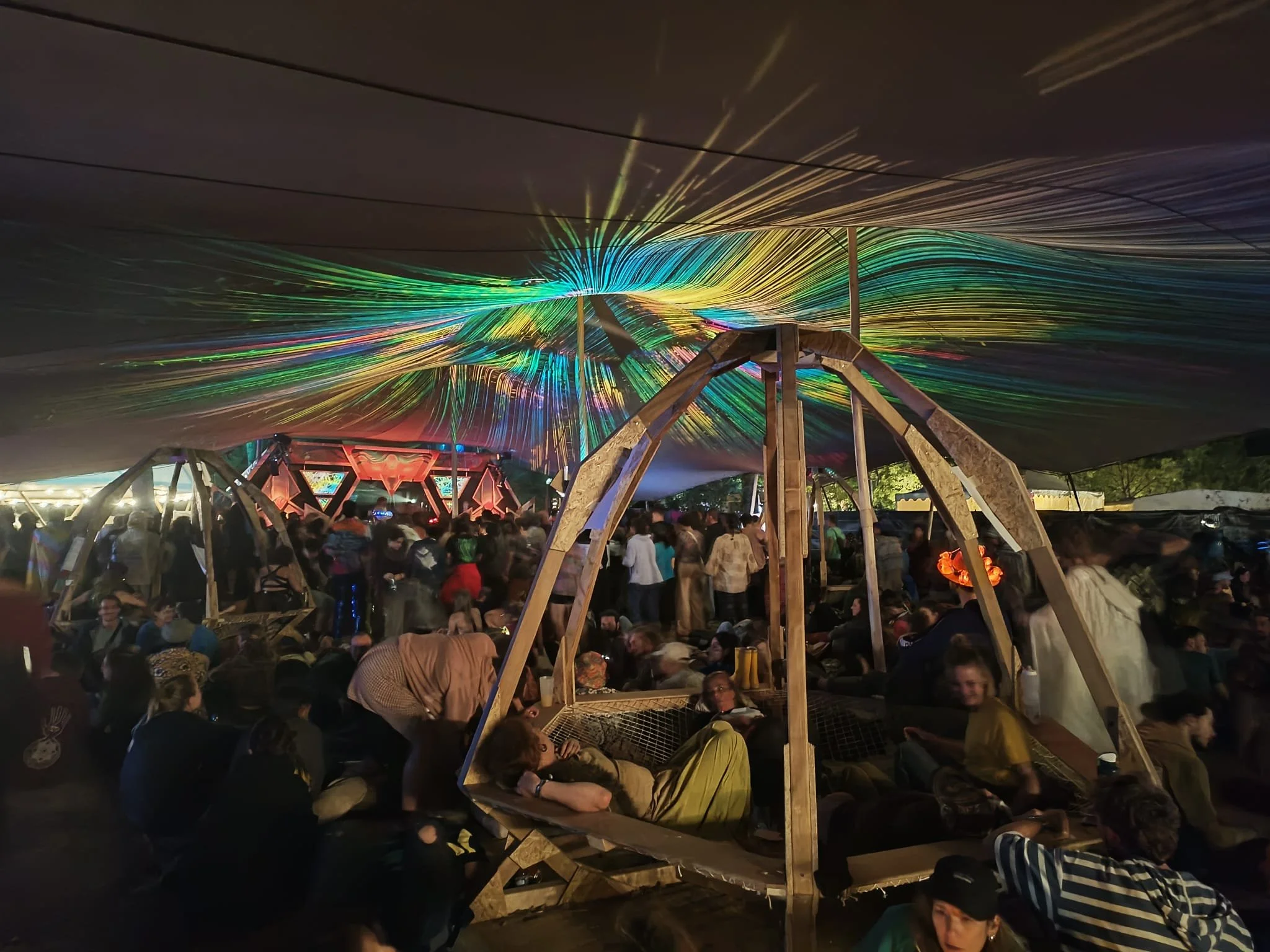 Les filets collectifs, eux, sont suspendus dans de grands cristaux de bois de 3 mètres. Chaque structure accueille un large filet capable de supporter une douzaine de personnes, ainsi que des bancs en périphérie. Installés sous la stretch tent de la Chill, ces modules offrent des usages variés : on peut s’y allonger, danser, s’asseoir… Le mobilier propose plusieurs niveaux d’occupation de l’espace, adaptés à différents moments du festival.