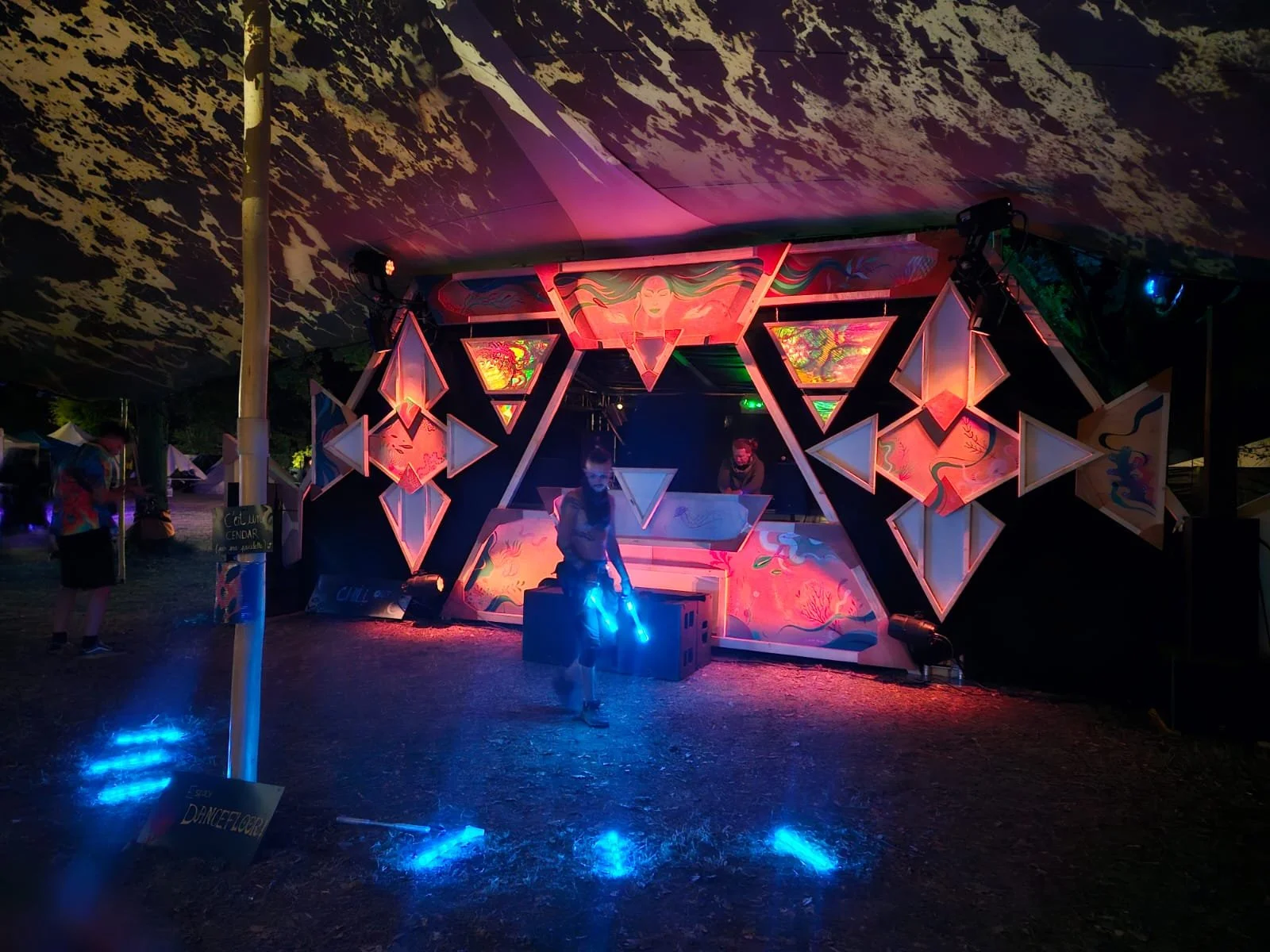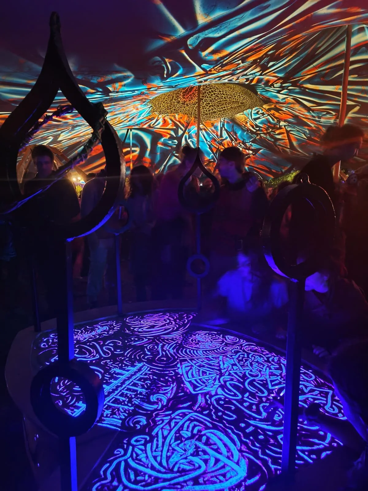 Les faces ont été habillées en contreplaqué, sur lesquelles Audrey a peint une Vouivre, apportant une touche artistique forte. Nous avons également ajouté des poteaux aux formes psychédéliques, permettant d’installer un tissu d’ombrage au-dessus du sable. En effet, l’installation est très sensible aux lumières parasites qui nuisent à l’effet de contre-jour, essentiel pour une bonne pratique du Sand Art.